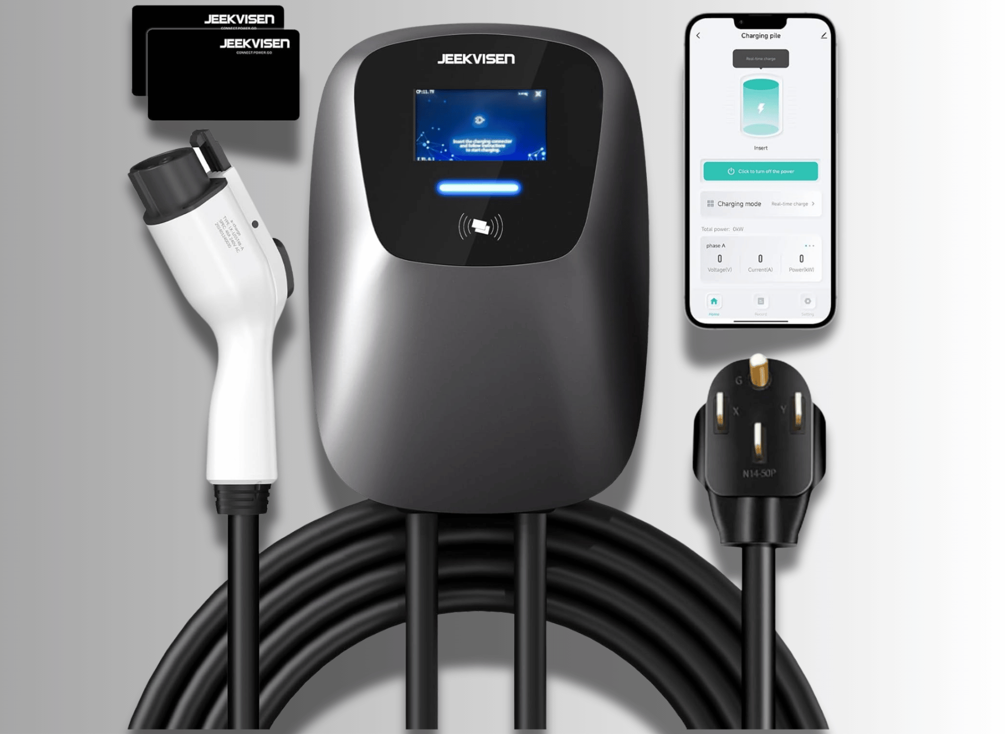 48 Amp 240V NEMA 14-50 Plug: Electric Vehicle Charging Station with APP Control, WiFi Enabled EVSE, RFID Card - Compatible with Tesla and All EV Brands (Gray)