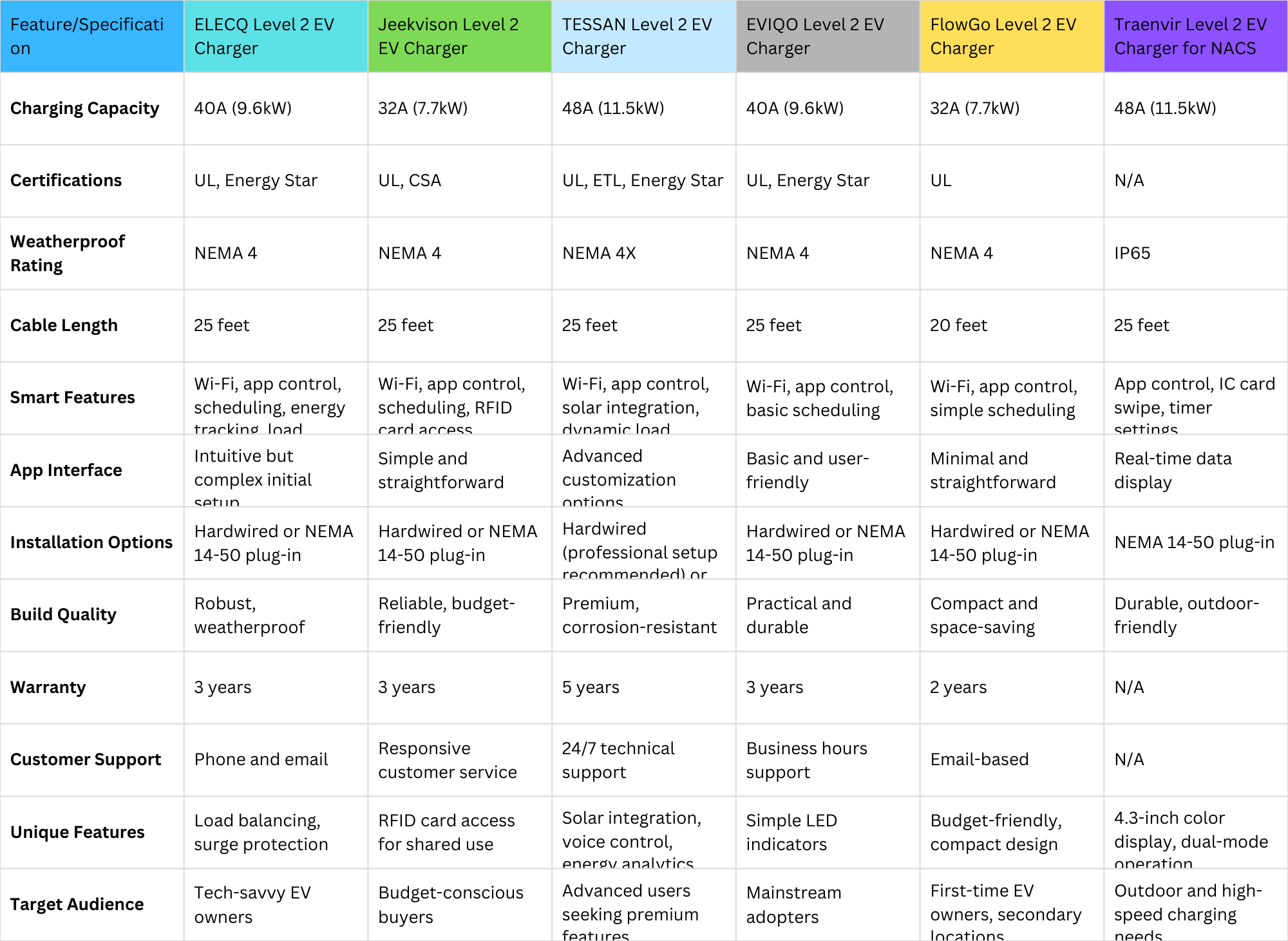 For most EV owners, 40A chargers like the ELECQ and EVIQO provide the optimal balance of charging speed and electrical requirements. These units handle overnight charging for virtually any EV while avoiding the electrical upgrades often required for higher-amperage installations.