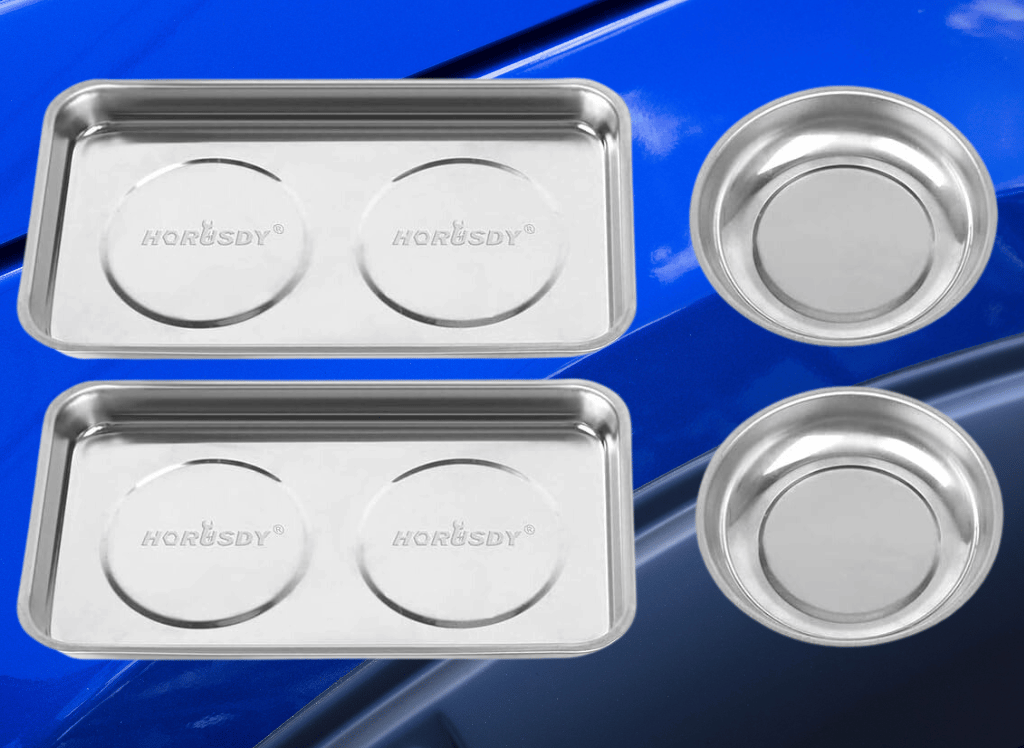 The HORUSDY 4-Piece Large Magnetic Parts Tray Set is crafted from high-quality stainless steel for ultimate strength and durability. This set includes a round tray measuring 4.5" x 4.5" (11cm x 11cm) and a square tray measuring 9.5" x 5.5" (24cm x 14cm), providing ample space for all your parts and tools.