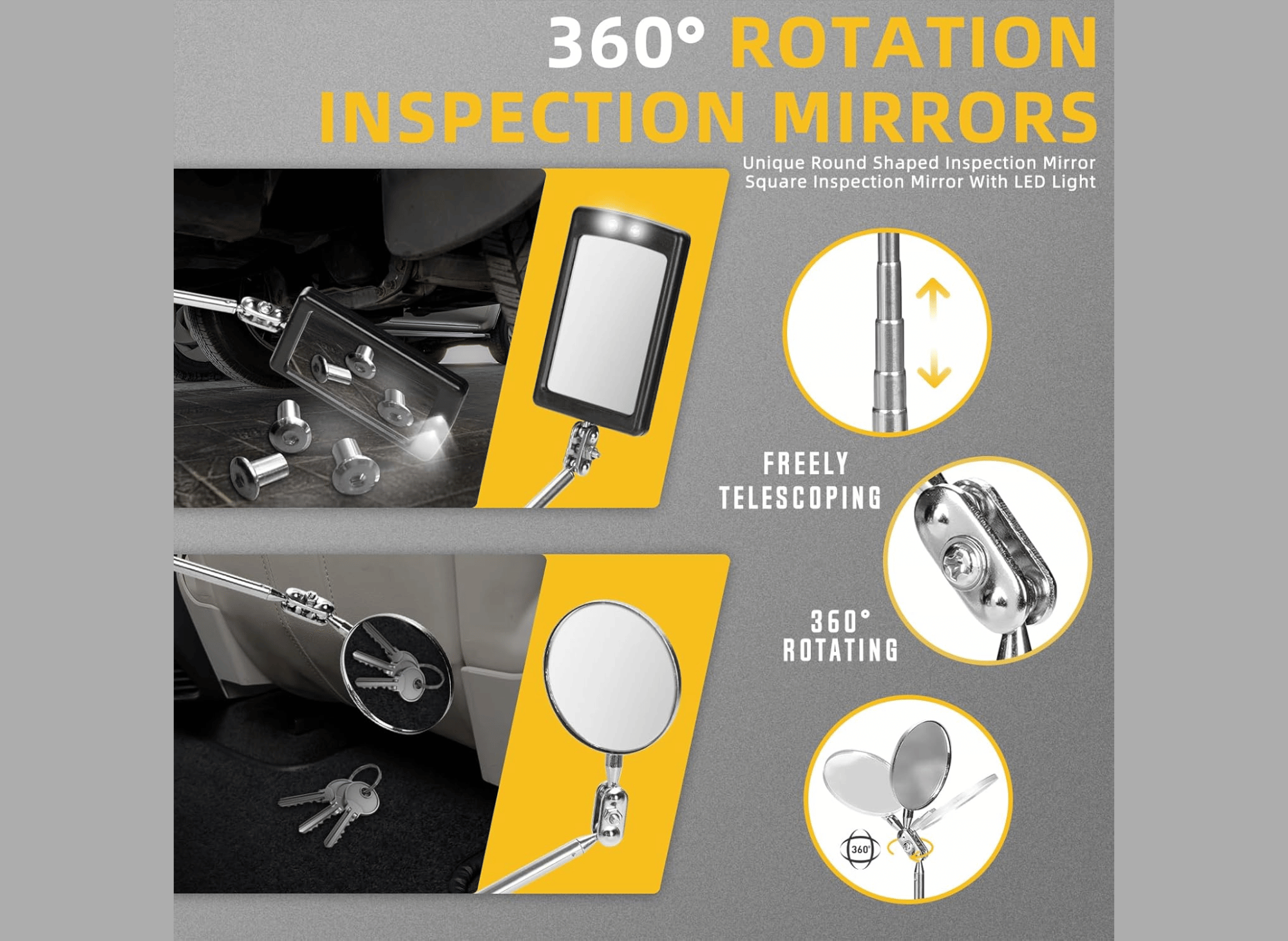 Both the LED flashlights and inspection mirrors feature full 360° swivel adjustment. This flexibility allows you to position the tools at any angle, ensuring optimal visibility and access regardless of the workspace constraints. The smooth rotation mechanism maintains its positioning during use without slipping or drifting.