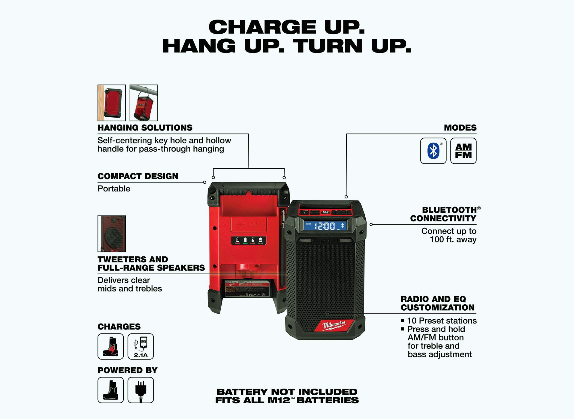 When it comes to job site audio, volume and clarity are critical. The M12 radio delivers unmatched sound that easily cuts through the ambient noise of power saws, drills, and heavy machinery, so you can turn it up and fill the jobsite with music.