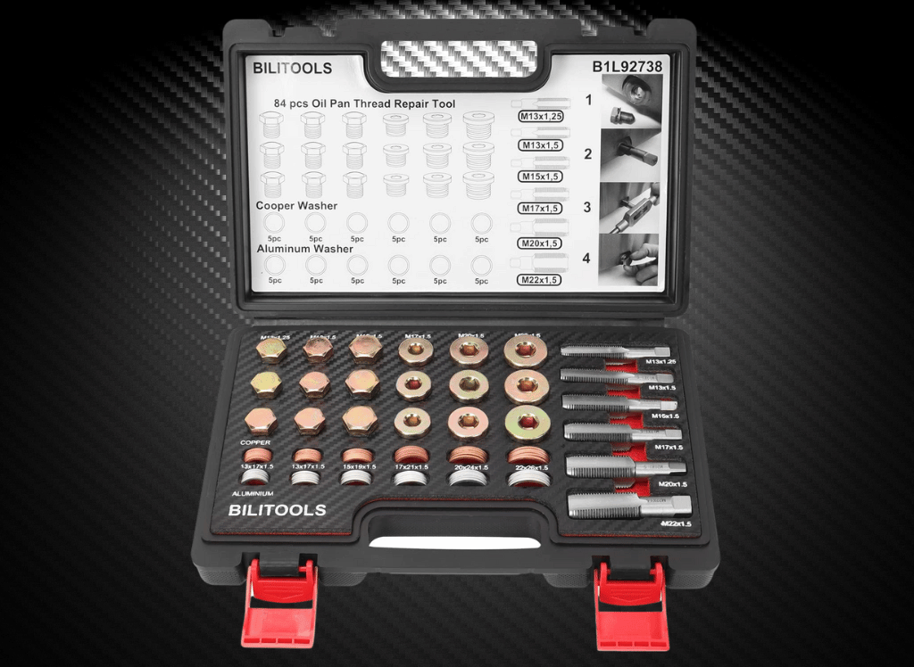 The Bilitools 84-Piece Oil Pan Drain Plug Thread Repair Kit also comes with a tap socket, tap guide, and all necessary tools to quickly and efficiently repair leaking or damaged threads on aluminum oil pans with steel threads.