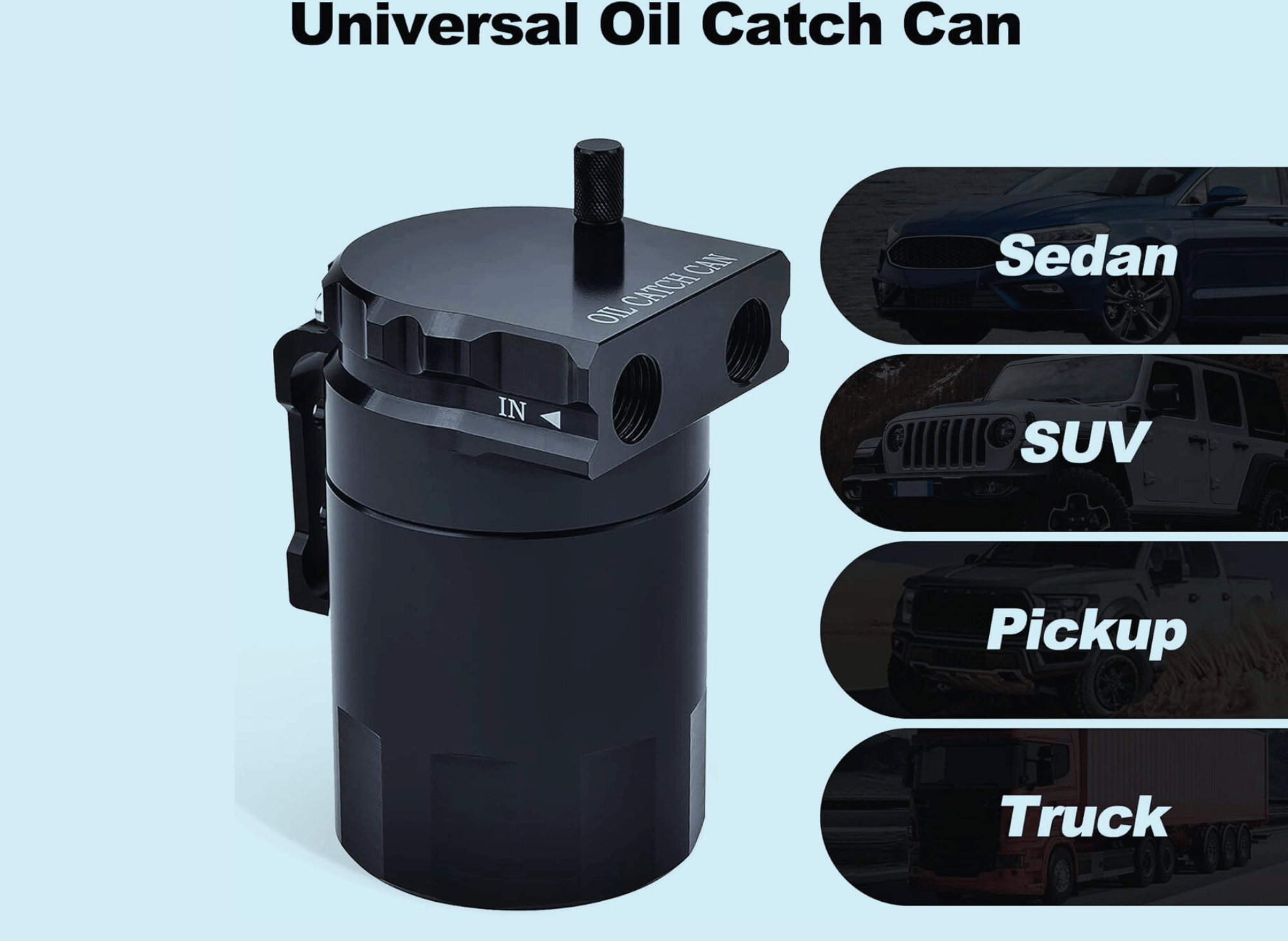 Designed to be universal for most cars, this 300ML capacity catch can come with three different size adapter fittings (6mm, 8mm, and 10mm) to ensure a perfect fit. It is simple to install; make sure there is enough space in your vehicle for installation.