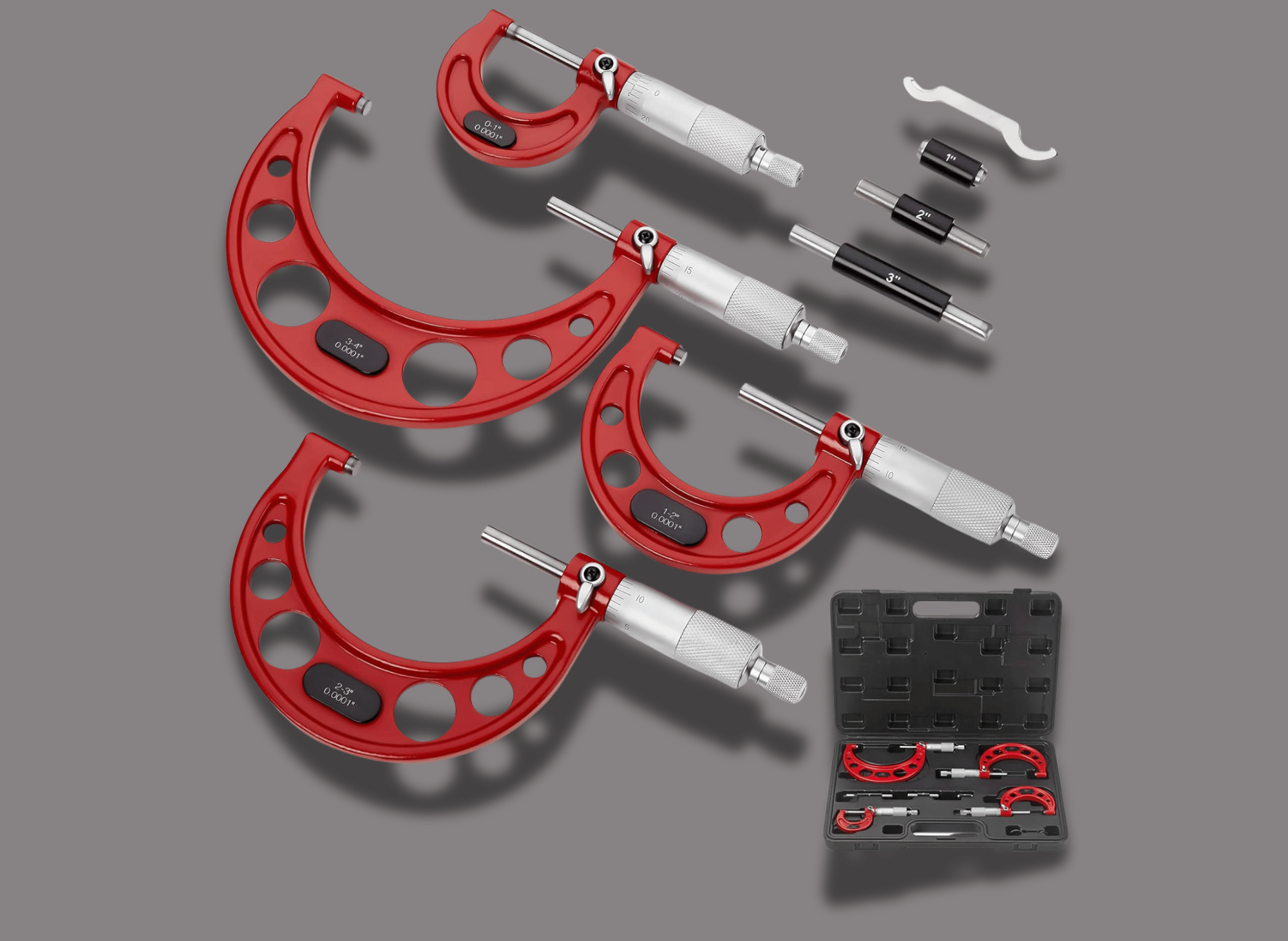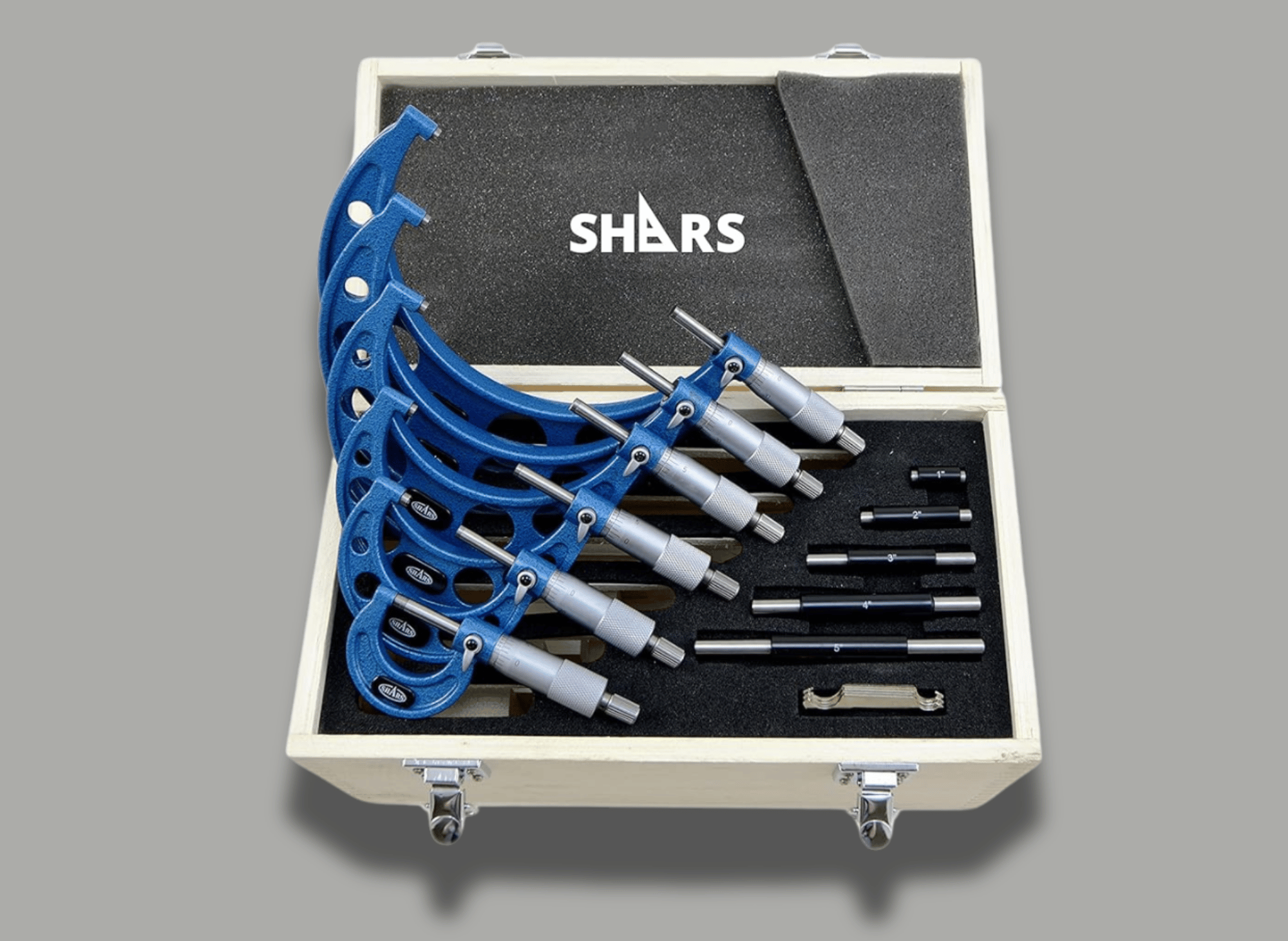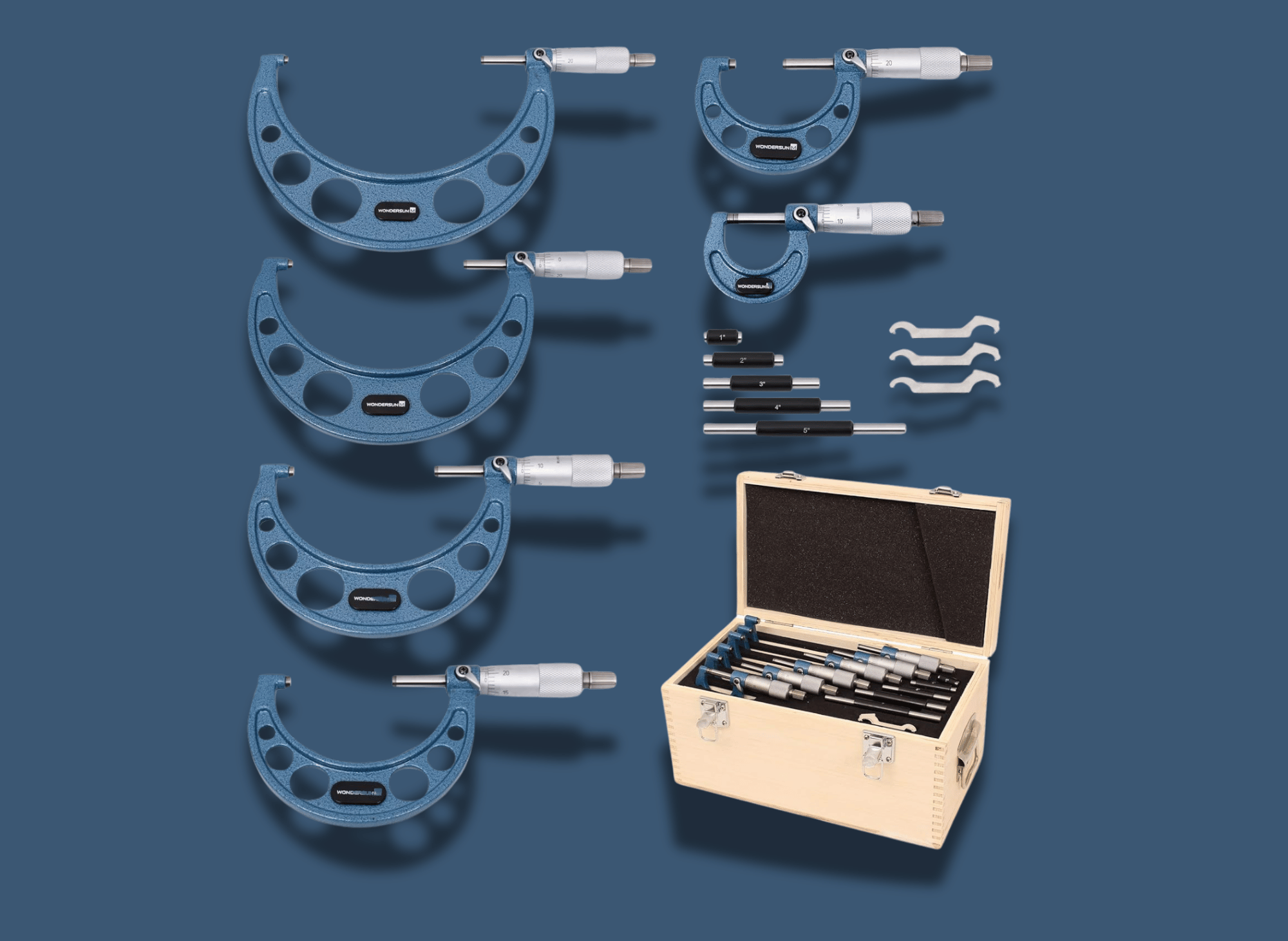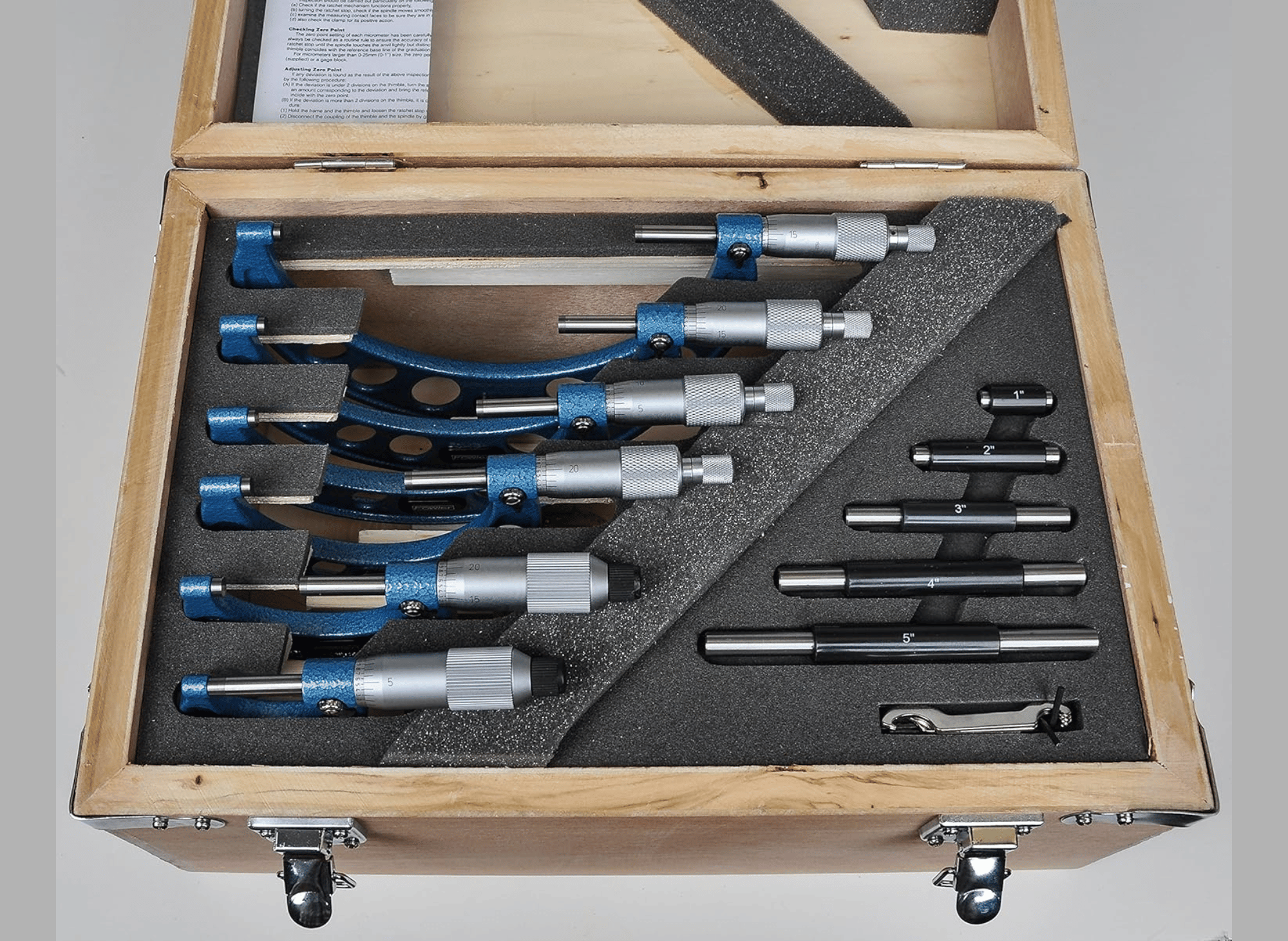 - Comprehensive Set: This set includes six micrometers (0-1”, 1-2”, 2-3”, 3-4”, 4-5”, 5-6”), calibration standards, and wrenches, all neatly packaged in a padded wooden case.