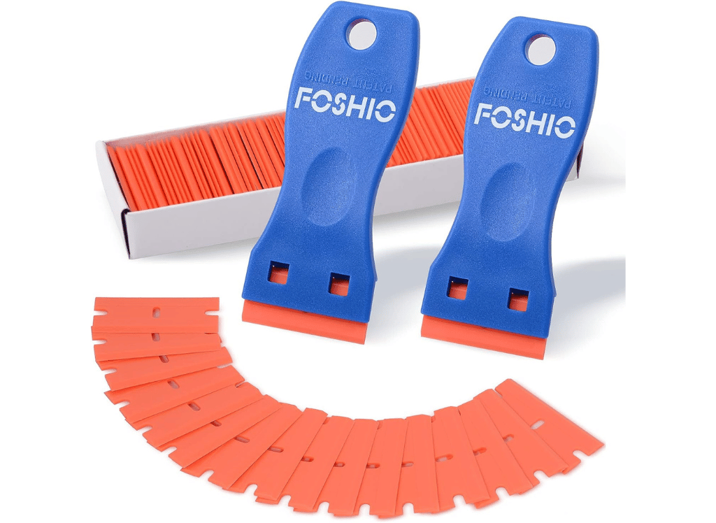 The Foshio Plastic Razor Blade Scraper is a versatile and efficient tool for scraping and cleaning. Its multi-functional plastic razor blade removes labels, stickers, window film, decals, and other adhesives from delicate surfaces such as car windows and windshields.