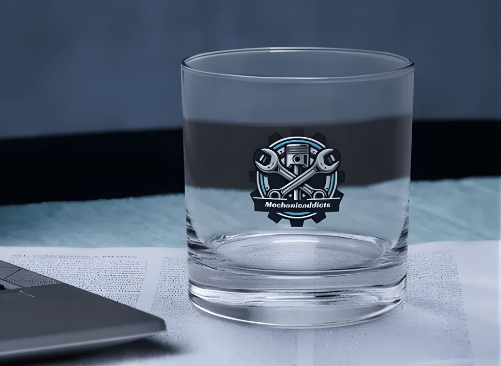 Precision-crafted rock glass featuring a detailed mechanical emblem.