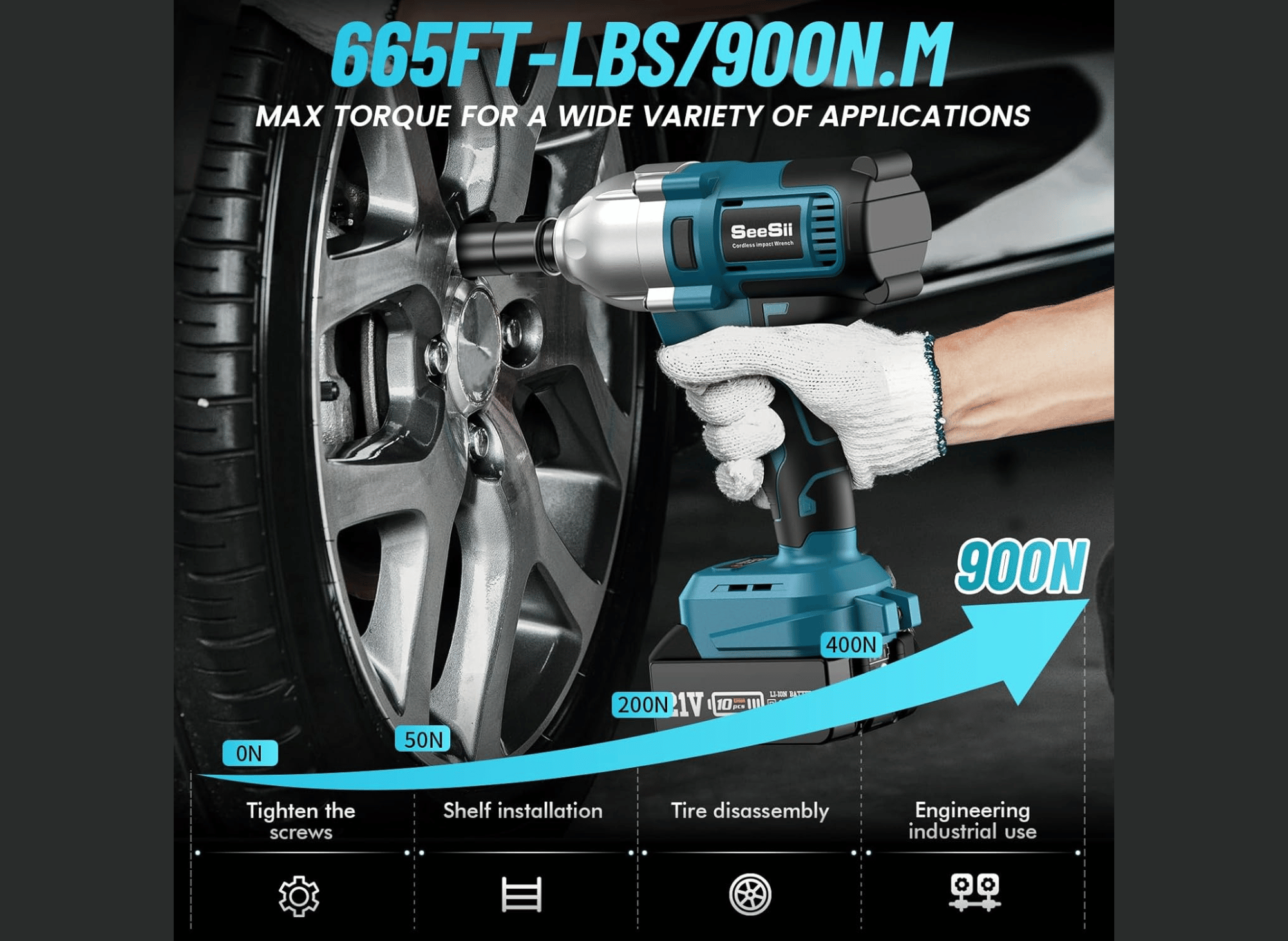 The Seesii impact wrench delivers up to 665 ft-lbs (900Nm) of max breakaway torque, making it one of the highest-performing cordless tools in its class. This high-torque performance allows users to easily handle heavy-duty tasks such as loosening rusted nuts, tightening suspension bolts, or even working on truck and heavy machinery repairs.