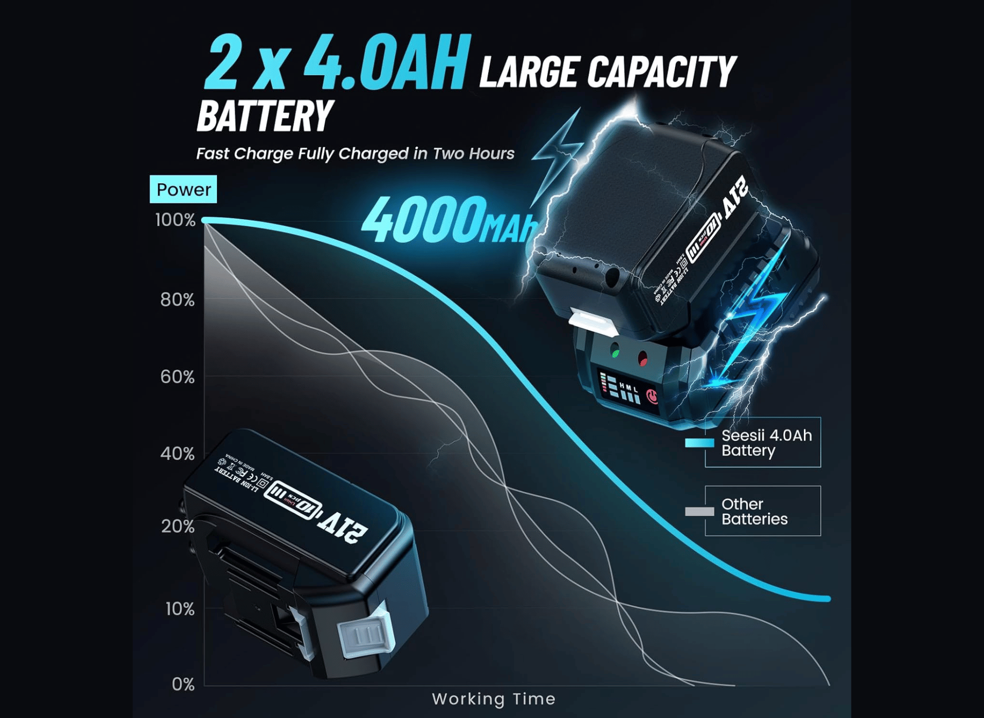 Cordless tools thrive on their ability to remove limitations caused by power cords. The Seesii high-torque wrench takes this further with its dual 4.0Ah lithium-ion batteries. These powerful batteries provide extended runtime, allowing you to complete your work without frequent interruptions to recharge.