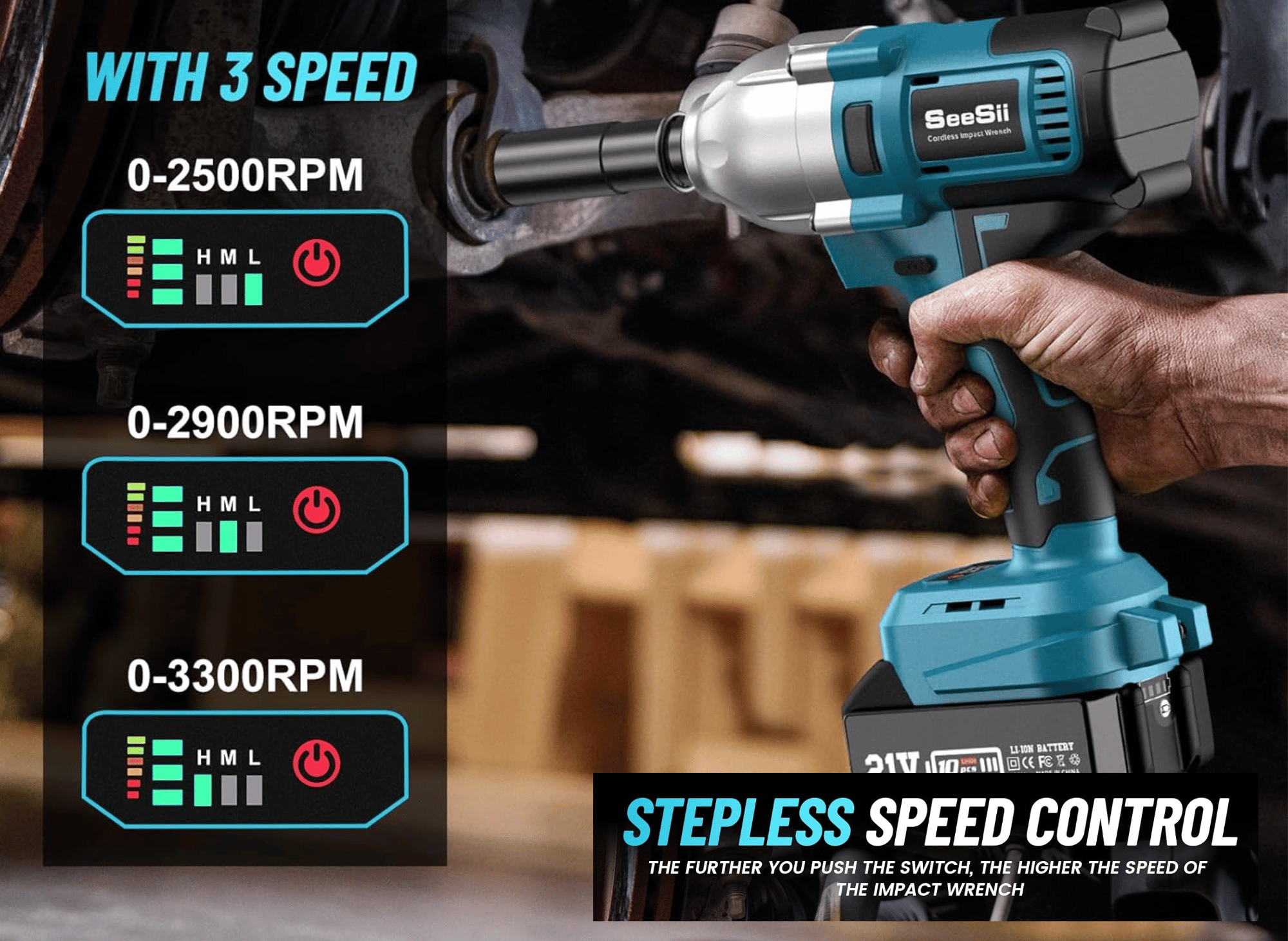 Different tasks require different power levels, and the Seesii impact wrench has you covered with three-speed settings (0-2500 RPM, 0-2900 RPM, and 0-3300 RPM). Adjusting the speed allows you to use just the right speed and amount of torque and force for the job.