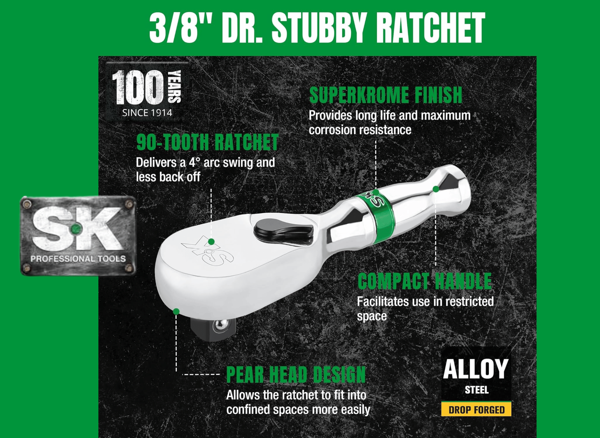 SK Tools are known for their durable, professional-grade construction. The 3/8" Stubby Ratchet is no exception, typically forged from high-quality alloy steel with a polished chrome finish.
