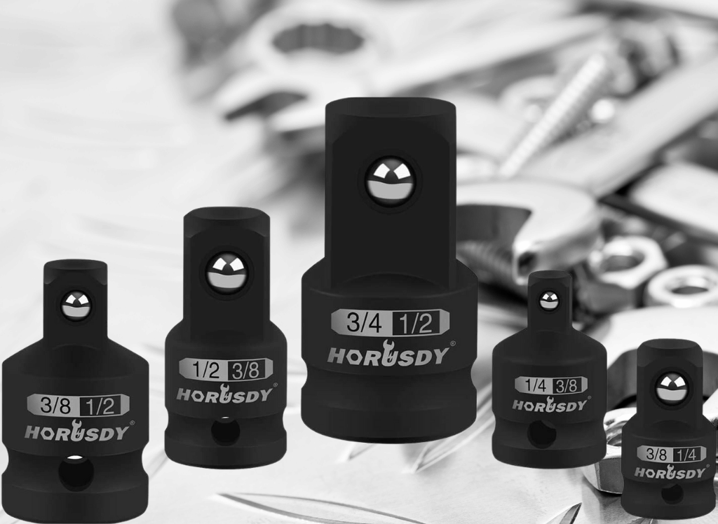 HORUSDY 5-Piece Impact Socket Adapter is made from heavy-duty drop-forged and heat-treated chrome vanadium steel for superior strength and durability. The black oxide coating enhances torque compression to tackle even the toughest jobs, while the bracket provides added stability.
