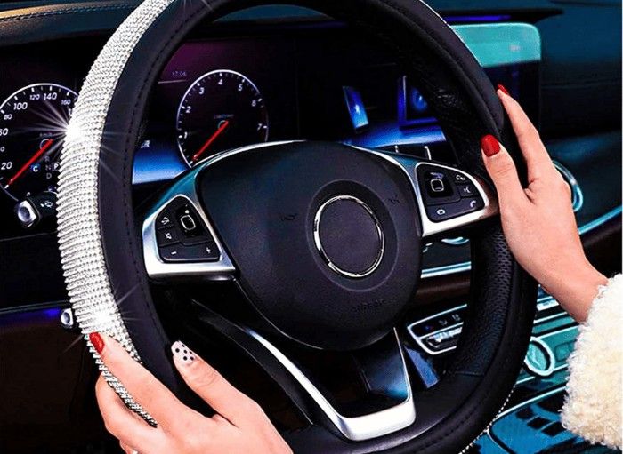 This bling steering wheel cover will fit most standard-sized steering wheels (37-38 cm/14.5-15 inches) from popular brands such as Audi, Buick, Chevrolet, Citroen, Fiat, Ford, Hyundai, Honda, Jeep Kia, Land Rover Lexus Mercedes Benz Mazda Peugeot Renault Skoda Sonata Volkswagen, and Volvo to name a few! Add sparkle to your vehicle today with our New Diamond Leather Steering Wheel Cover!