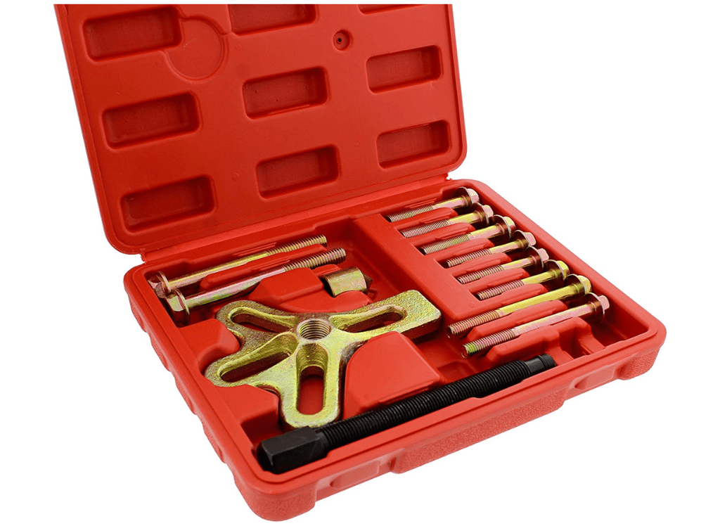 The ABN 13 Piece Harmonic Balancer Steering Wheel Puller Kit helps you quickly and safely remove harmonic balancers, gear pulleys, steering wheels, and crankshaft pulleys. Its versatile yoke allows for easy two- or three-hole application with even pressure applied to car parts to safeguard against damage. Built for lasting performance over extended use, each piece of this puller kit is hardened and tempered for extra strength. With its machine-precision design, this flywheel puller tool will give your auto maintenance needs the support they need.