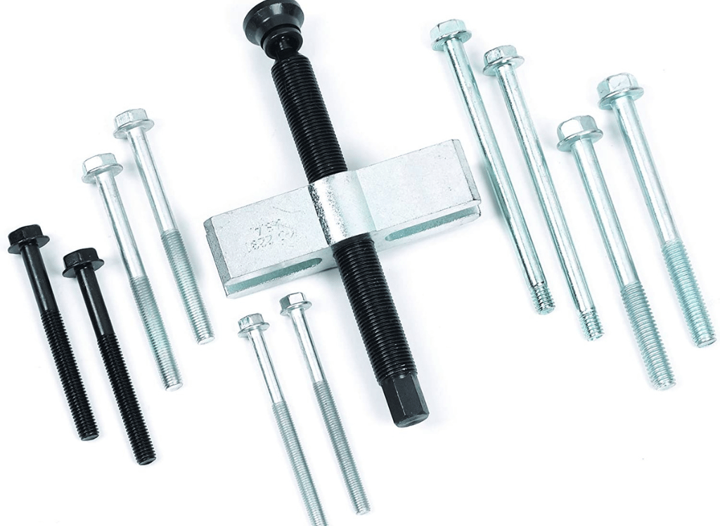 The ABN 13 Piece Harmonic Balancer Steering Wheel Puller Kit is the perfect tool for various applications. This kit includes (1) floating swivel, (2) 5/16 by 4 inch (7.9mm x 101mm) bolts, (2) 1/4 by 3 inch (6.3mm x 76mm) bolts, (3) 1/4 by 2 inch (6.3mm x 50mm )bolts and (3) 5/16 by 2 inch(7.9 mm x 50 mm ) bolts which makes it suitable for a wide range of tasks related to harmonic balancers and steering wheels removal or installation purposes. Additionally, all pieces are stored in a durable blow-molded plastic case that ensures efficient organization and identification of the parts included in this set.