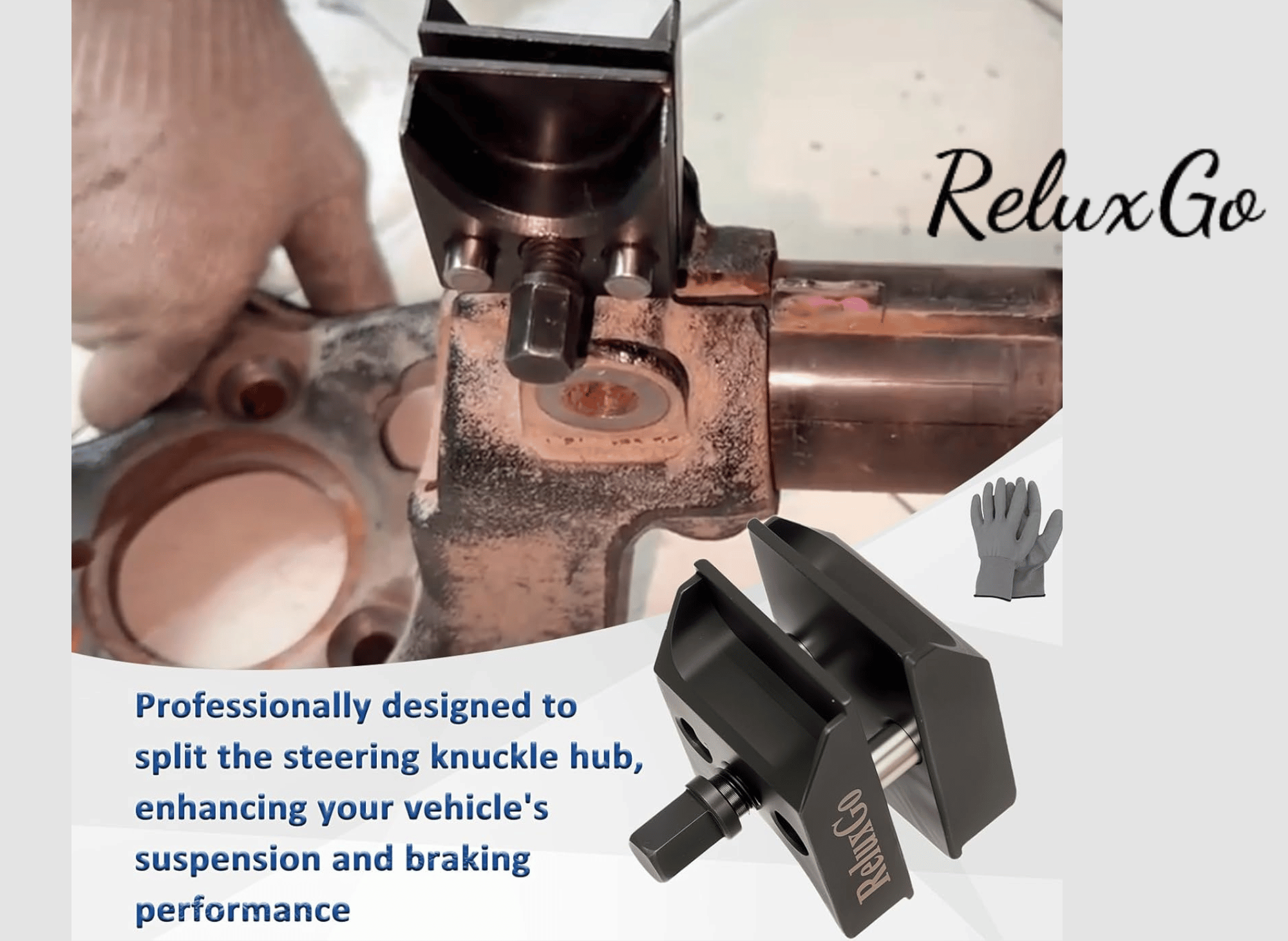 - Insert the Tool: Insert the spreader tip of the ReluxGo tool into the now-empty slot in the steering knuckle. You may need to tap it in gently with a hammer to ensure it is fully seated.