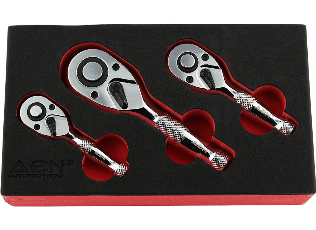 The ABN Stubby Ratchet Tool Kit is the perfect tool to help you with any project. This set provides versatility in tight spaces, featuring a 3/8 drive, 1/4 inch, and 1/2 inch ratchet wrench, each with 72 teeth for precise control. Changing directions quickly is easy with its short-handle design.
