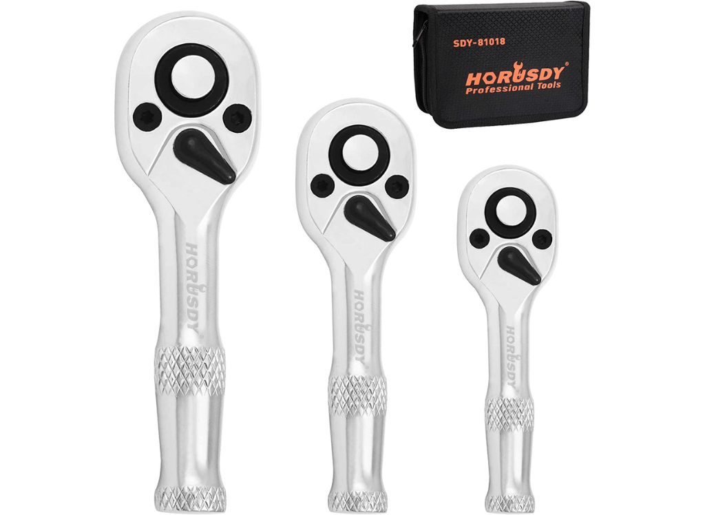 The HORUSDY Stubby Ratchet Set is the perfect solution for tackling jobs in tight spaces. It includes 1/4", 3/8", and 1/2" drive sockets that are compact and lightweight, measuring up to 5.23” in length.