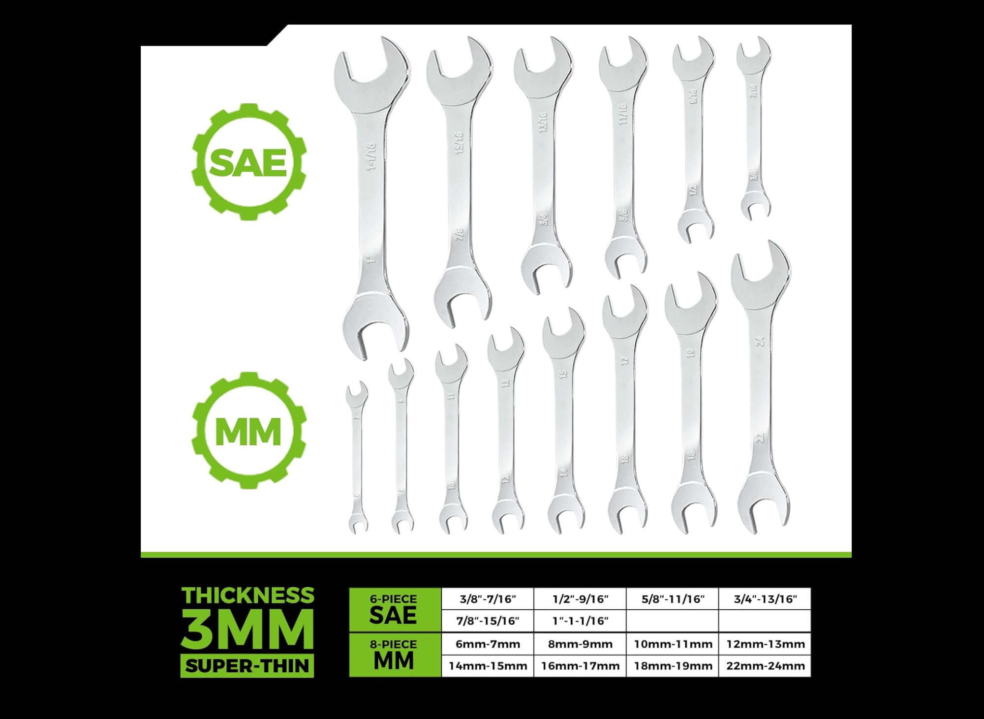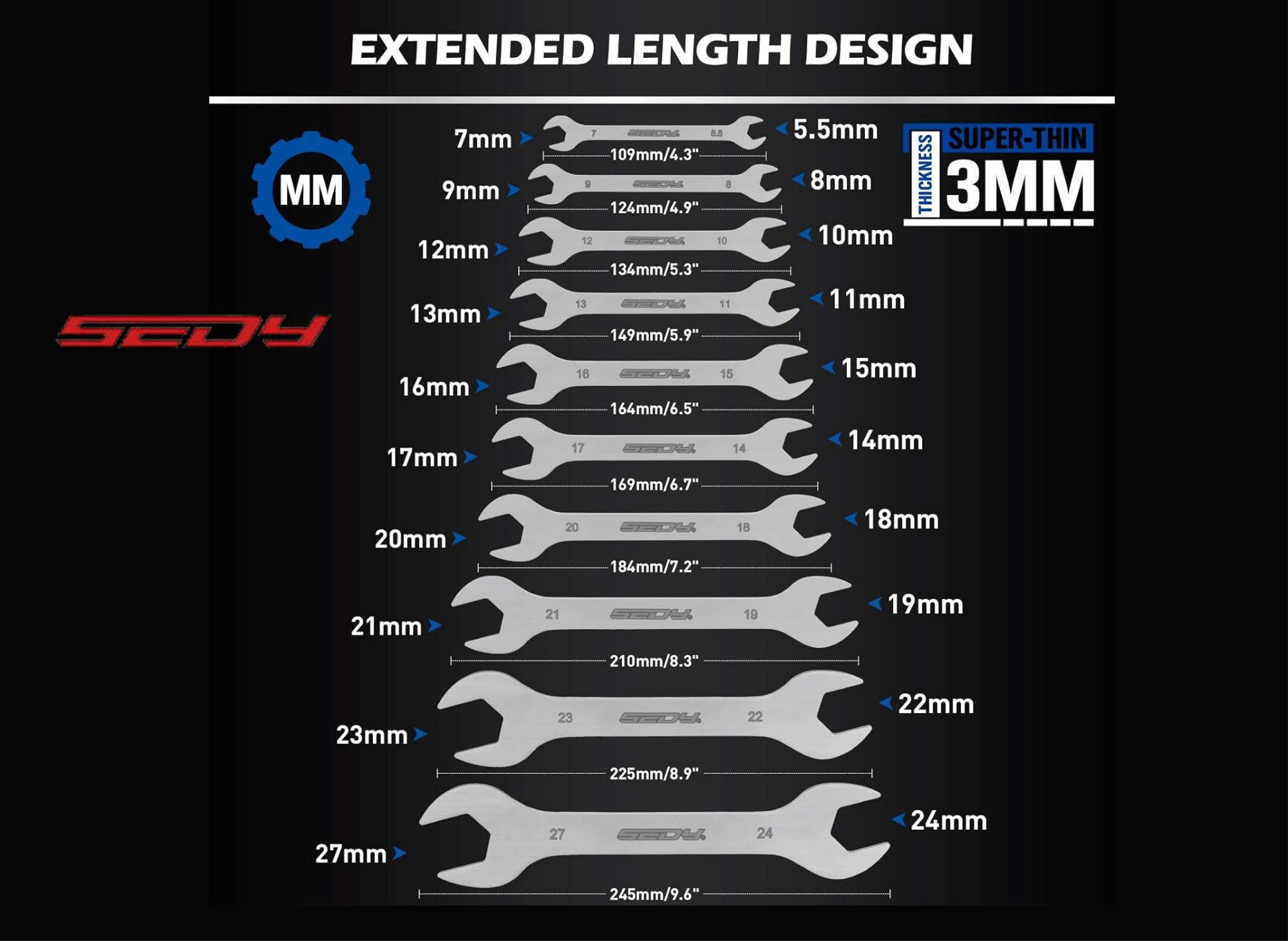 The Super-Thin Open-End Wrench Set is crafted from premium carbon steel, ensuring durability and strength with a mirror-polished, rust-resistant finish. Its standout feature is the ultra-slim 3mm design, perfect for accessing tight spaces where traditional wrenches can't reach.