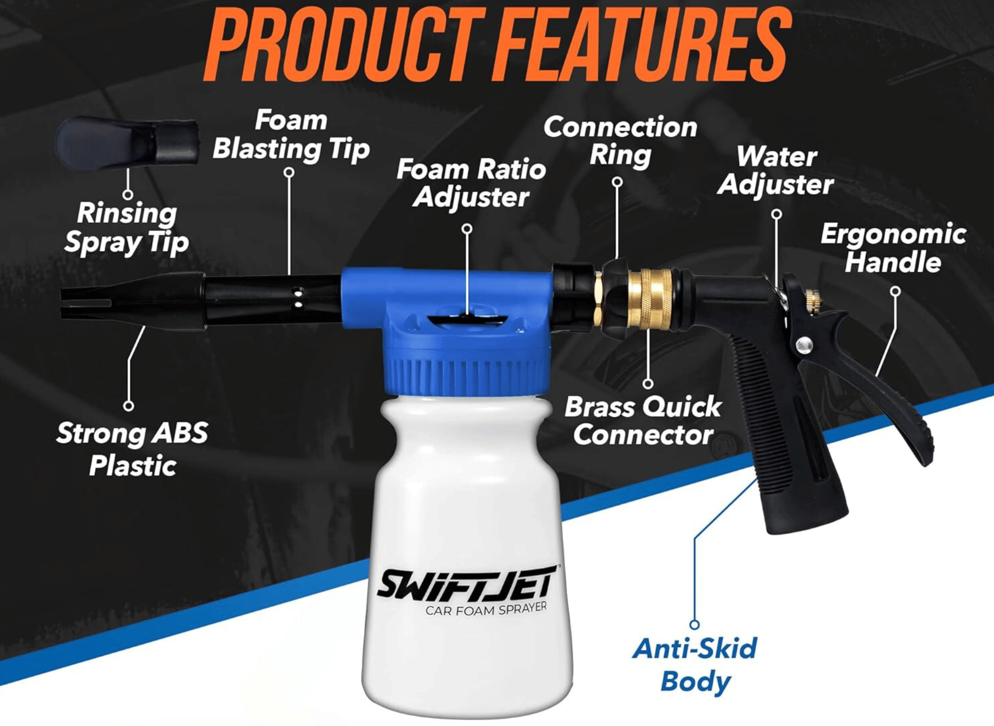 Every detail of the SwiftJet Foam Gun, including its ergonomic design, is crafted to make car washing easier, faster, and more effective. Check out its standout features below: