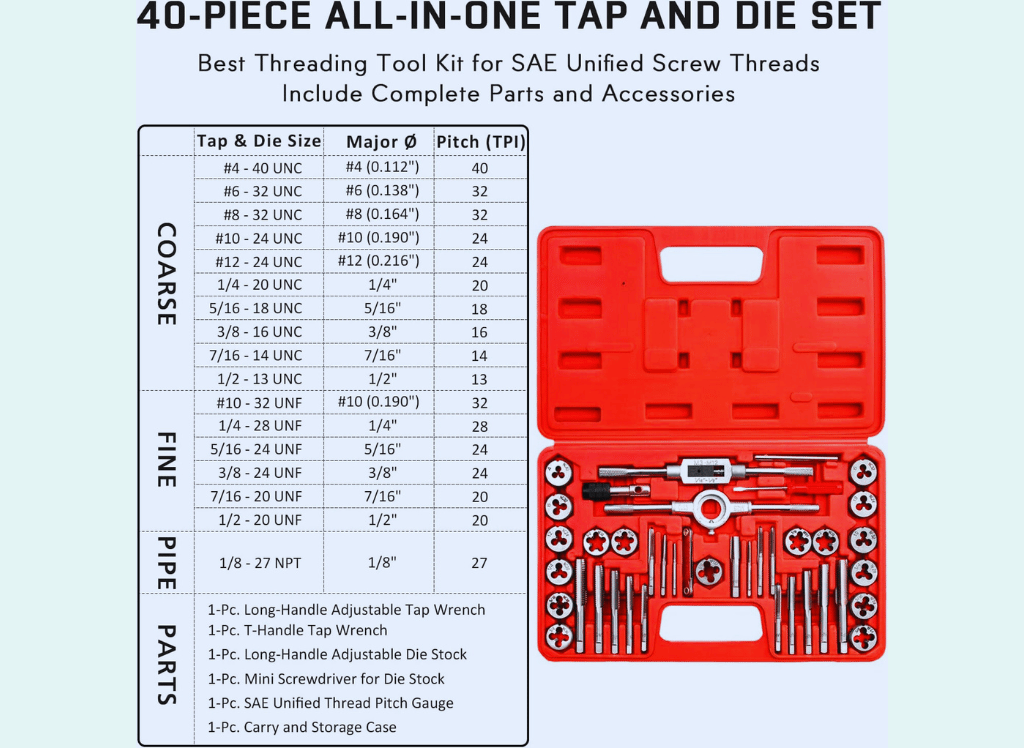 This kit comes with a full range of the most popular SAE taps & dies with coarse and fine sizes, plus all needed wrenches, handles, a gauge, and a storage case.