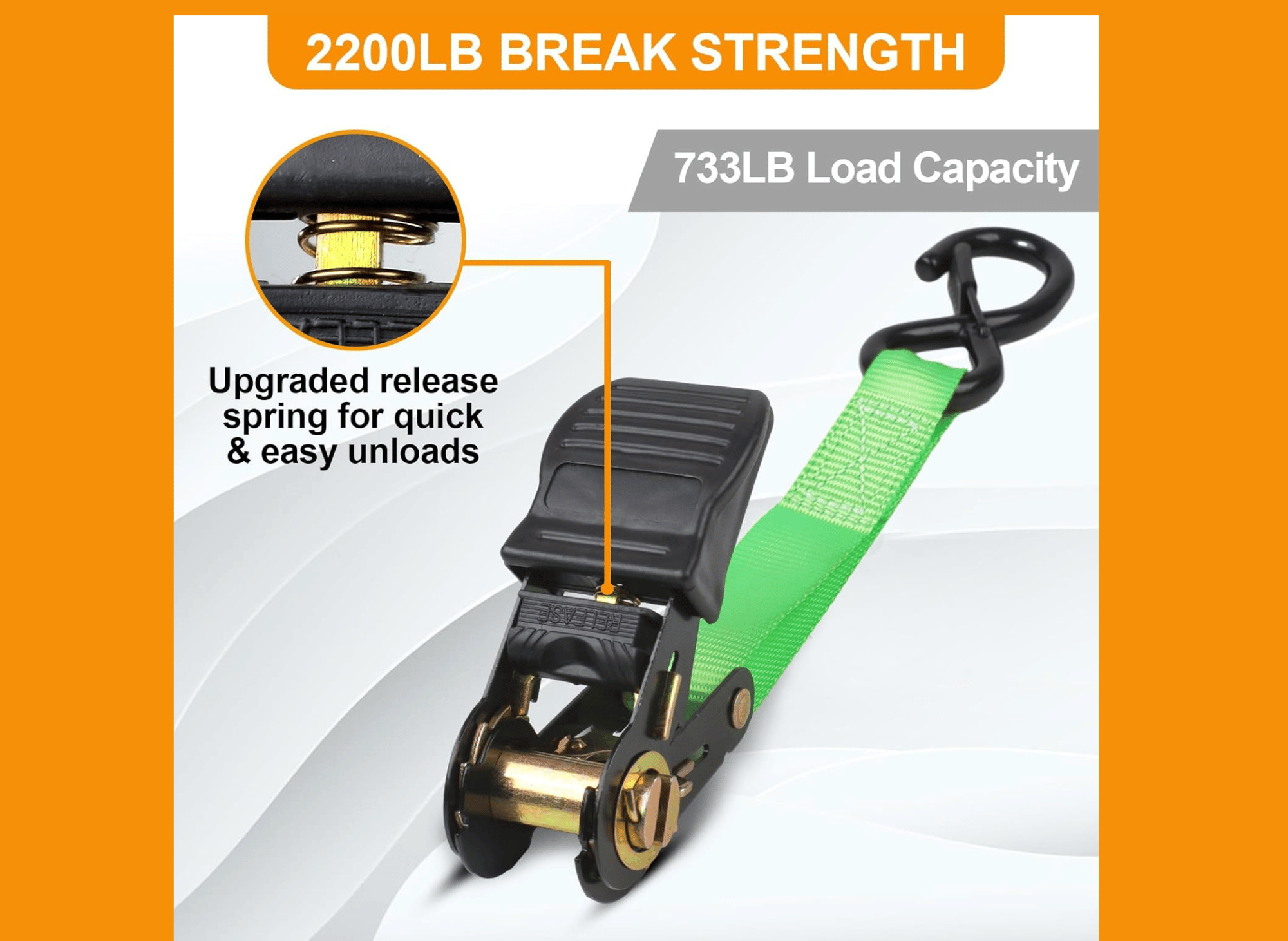 - Break Strength: Up to 2200 pounds, making these ideal for heavy-duty use. The working load capacity of 733 pounds ensures they handle various vehicle securement needs. Knowing the Working Load Limit (WLL) is crucial when selecting straps to ensure they can handle the weight of the cargo.