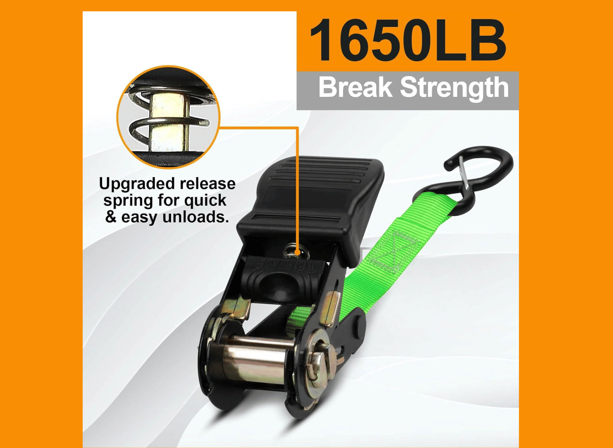 Durable and reliable ratchet tie-down straps for trucks, ATVs, and more. They have amazing break strength, padded handles, and safety hooks.