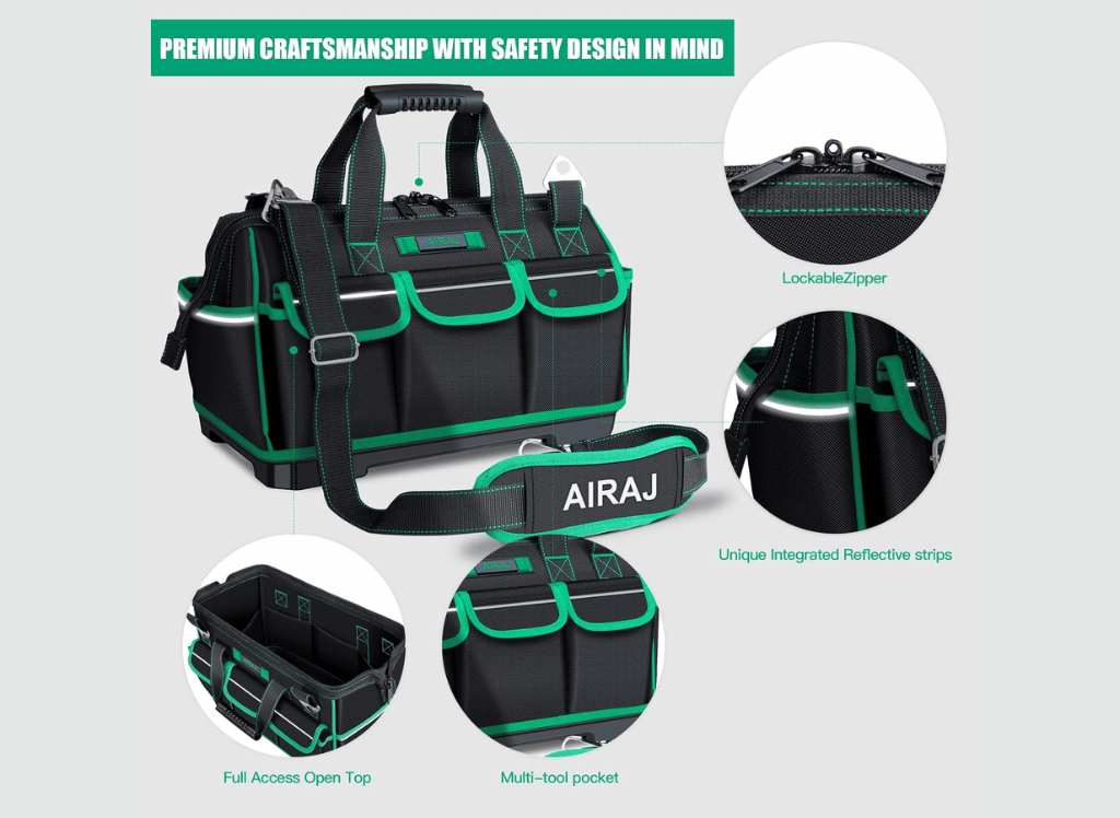 AIRAJ 16 Inch Tool Bag with Night Reflector Strip is the ultimate tool bag for professionals and enthusiasts alike. With its impeccable design and durable construction, this tool bag is built to withstand even the toughest of jobs.