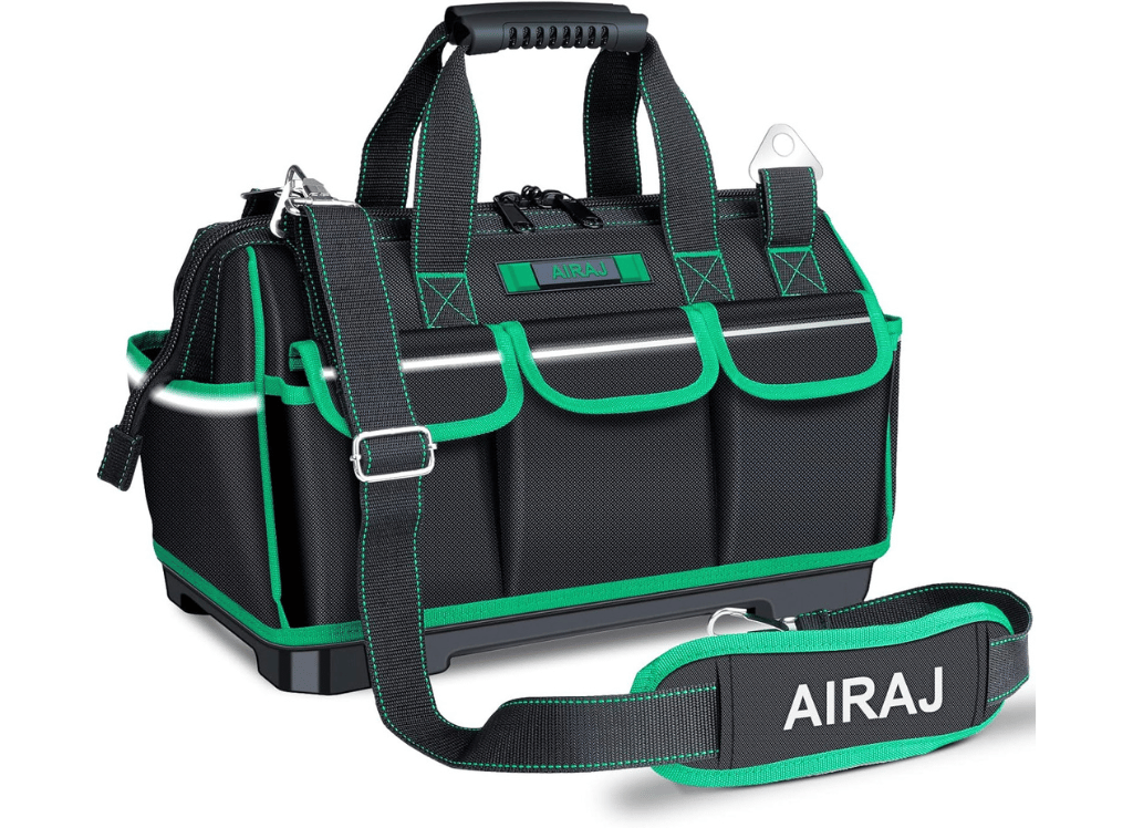 The AIRAJ 16-inch tool Bag with Night Reflector Strip is the ultimate tool organizer for any professional or DIY enthusiast. Its sturdy hard molded ABS base provides superior water resistance, wear resistance, and durability compared to other ordinary tool bags on the market.