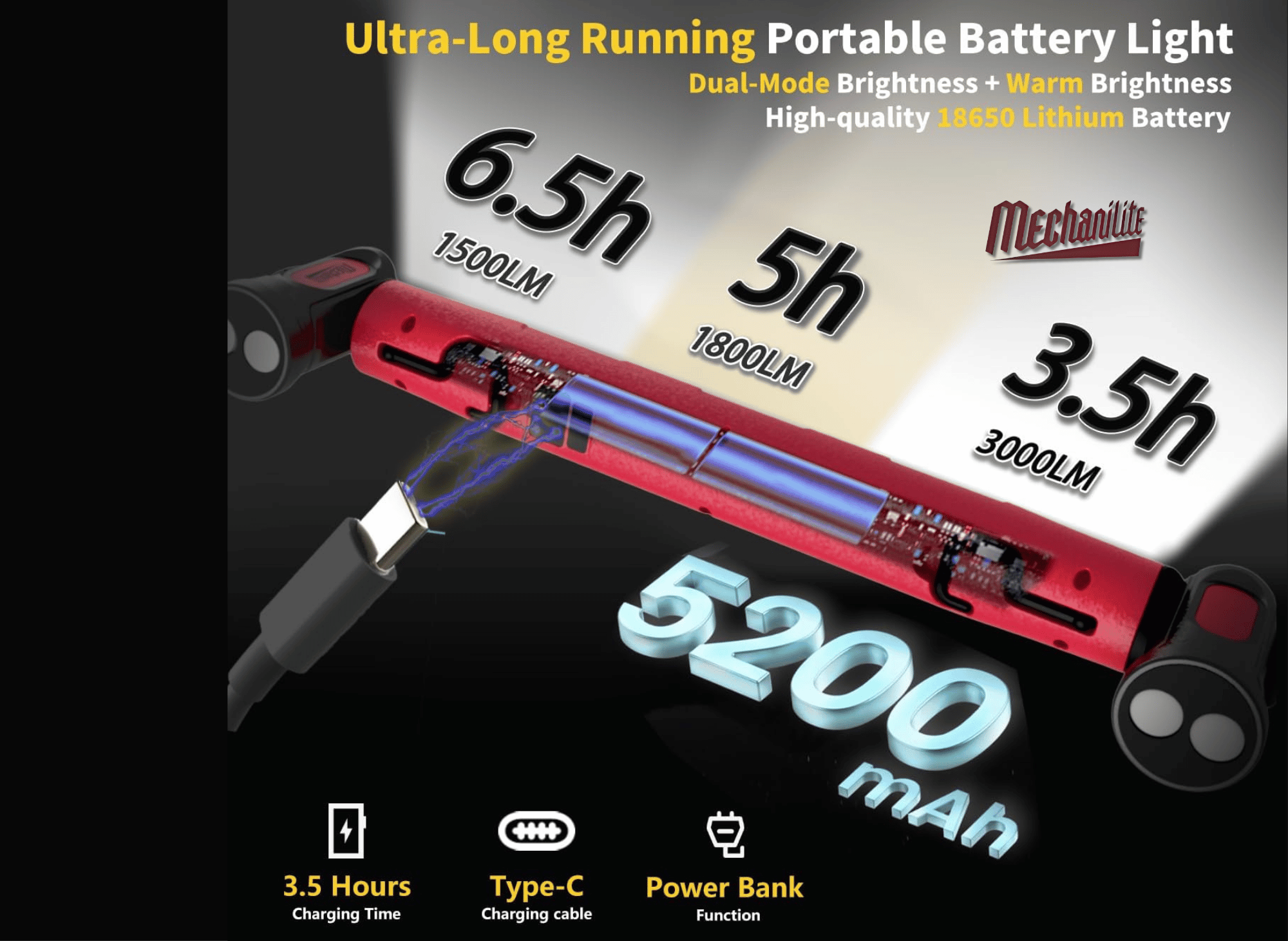 Say goodbye to constantly replacing batteries. MechaniLite comes with a high-capacity, rechargeable battery that provides hours of continuous light on a single charge. The long runtime ensures it will last through even the most time-consuming repairs.