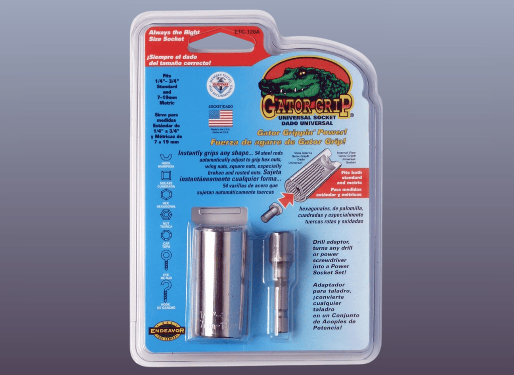 The Gator Grip is the original self-adjusting universal socket revolutionizing the tool industry. Proudly made in the USA, this 3/8-drive socket comes with a power drill adapter and eliminates the need for a toolbox of tools, sockets, wrenches, pliers, and more.