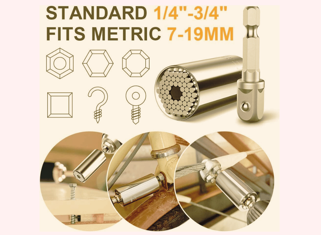 Designed to fit standard 1/4 to 3/4 inch nuts (metric 7mm to 19mm) and various shapes and sizes of objects, this universal socket's unique design allows it to adjust and grip a wide range of fasteners instantly. No more searching for the correct size socket or struggling with stripped or damaged bolts—their super-brand tool covers you.