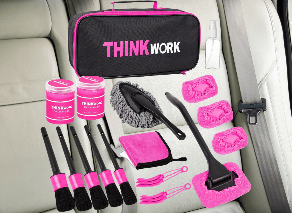 The THINKWORK Pink Car Duster Interior Kit is a comprehensive set of car detailing tools to make it easier to keep your vehicle looking pristine. The 17-piece kit includes five detail brushes, three cleaning pads, two cleaning gels, two air vent brushes, one window brush, one watering can, and a duster brush for fast and efficient dust removal.
