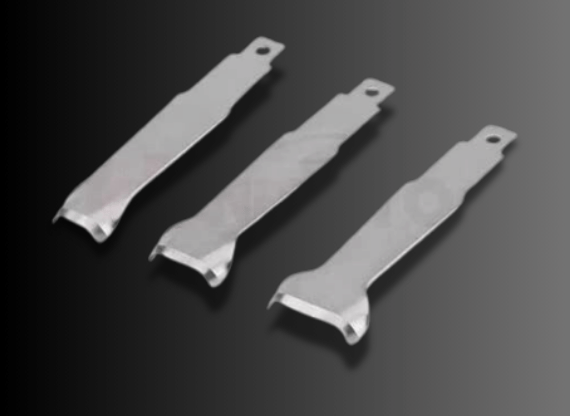 The thin blade features a single-edge cutting design with a slight curvature, allowing it to fit closely to the treated surface. This versatile kit includes three different blade sizes (1 inch, 0.925 inch, and 1/2 inch) suitable for up to 80% of windshield urethane removal work.