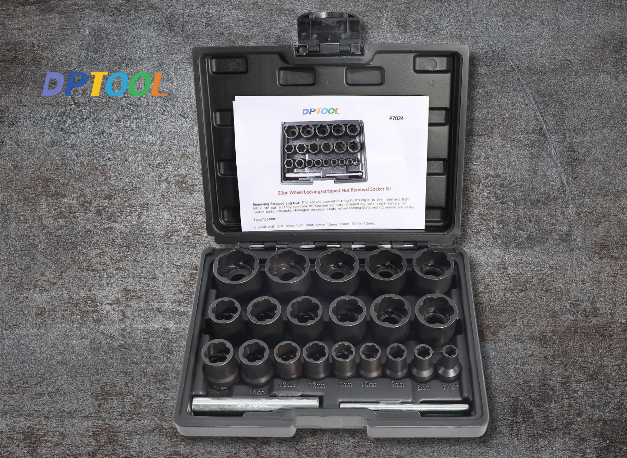 Sometimes, a lug nut is completely rounded off or severely rusted. In these scenarios, specialized bolt extractors are necessary. Tools like the DPTOOL 22 Piece Bolt Nut Extractor Set utilize reverse spiral flutes that bite into the damaged metal. These impact-grade kits are designed specifically to extract frozen or stripped nuts that standard sockets cannot grip.