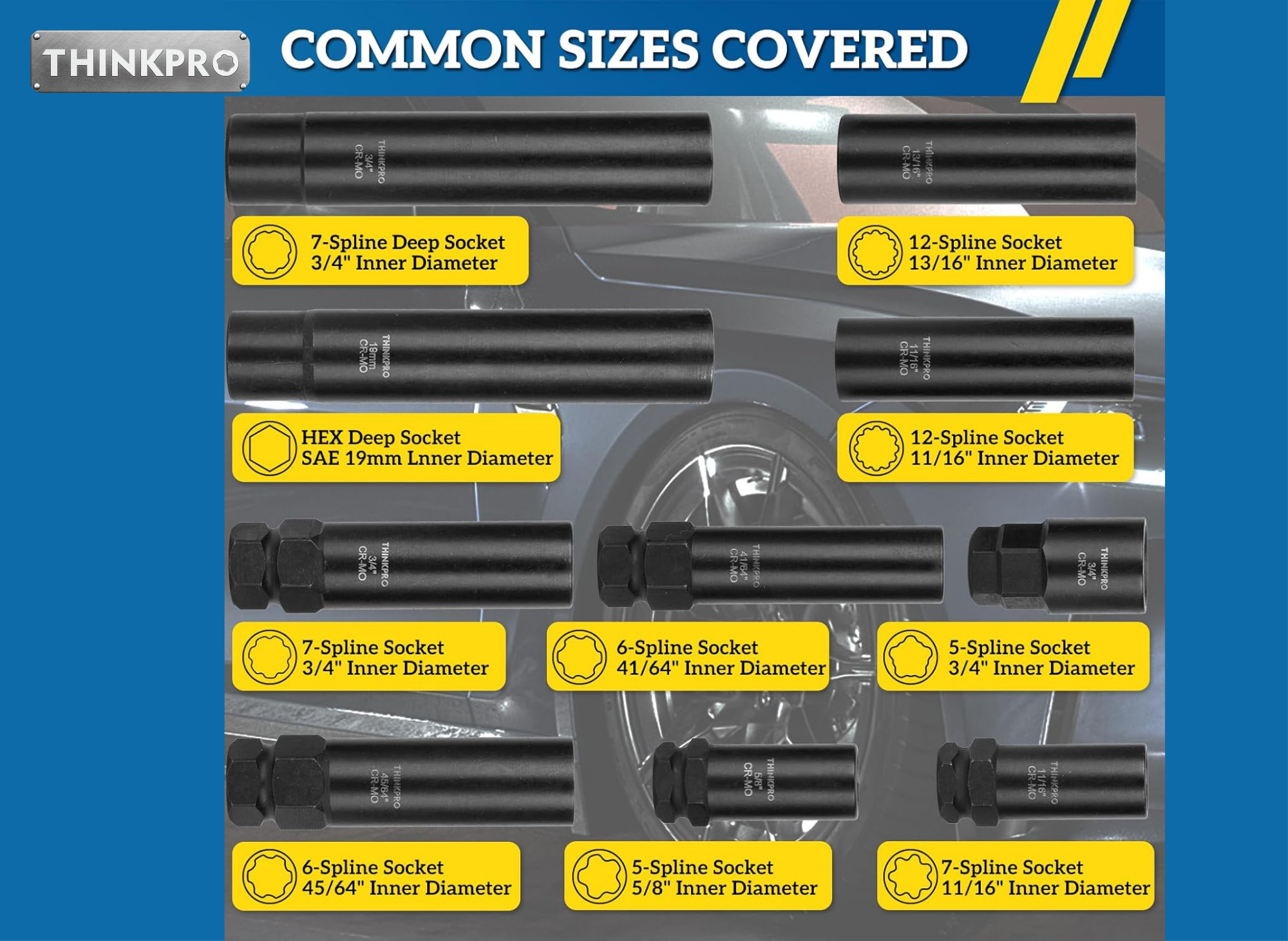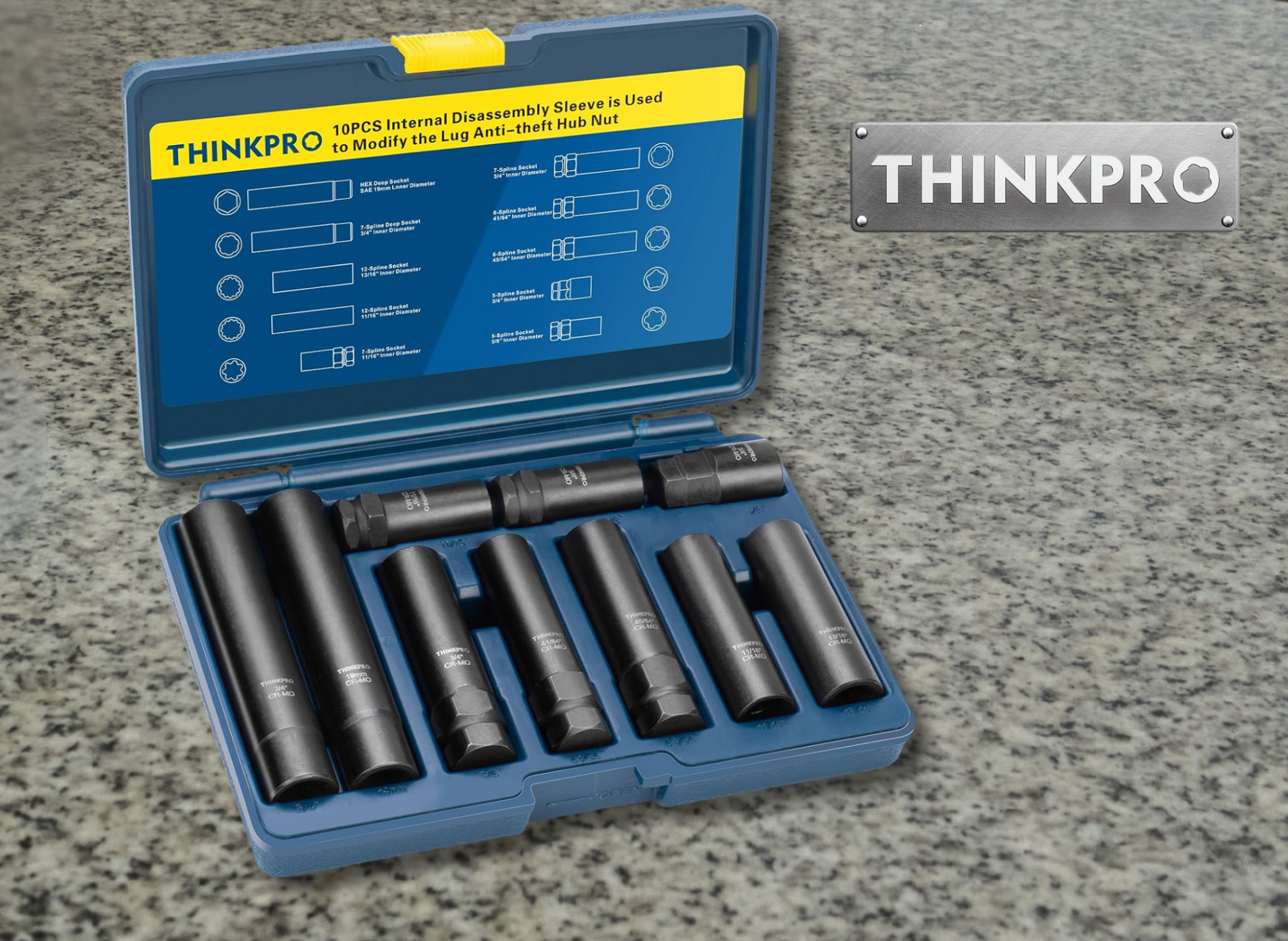 The Thinkpro set is constructed from Pro-Grade Cr-Mo Steel and features deep sockets that accommodate recessed lugs. It handles over 500 ft-lb of torque and includes a lifetime warranty against breakage. This kit is highly regarded as a roadside essential for its broad compatibility.