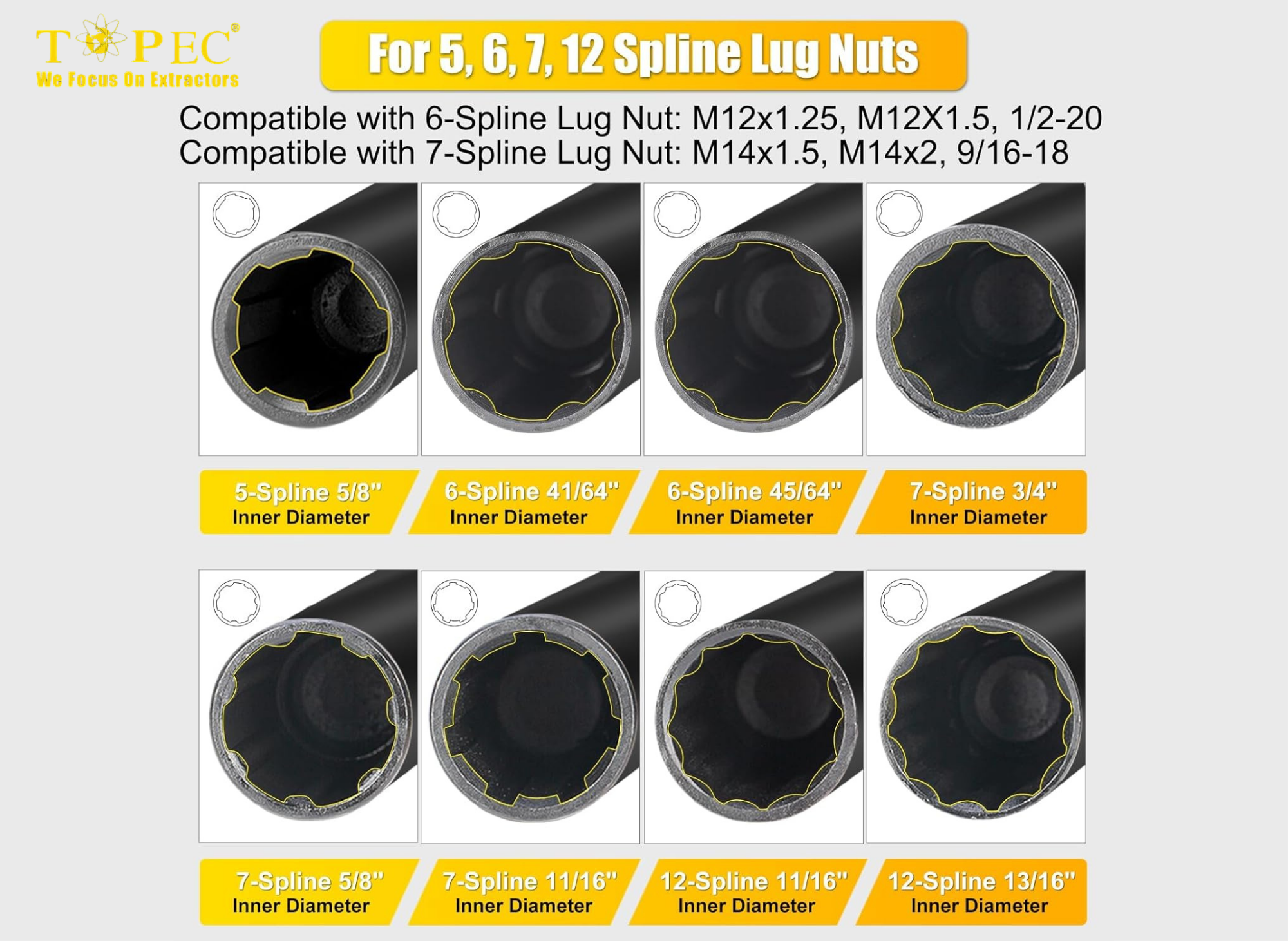 5, 6, 7, 12 Spline Socket Set, Star and Internal Hex Style Lug Nut Key Set, CR-MO Steel (Not for Hex, Deep, Large-Size, and 10-Spline)