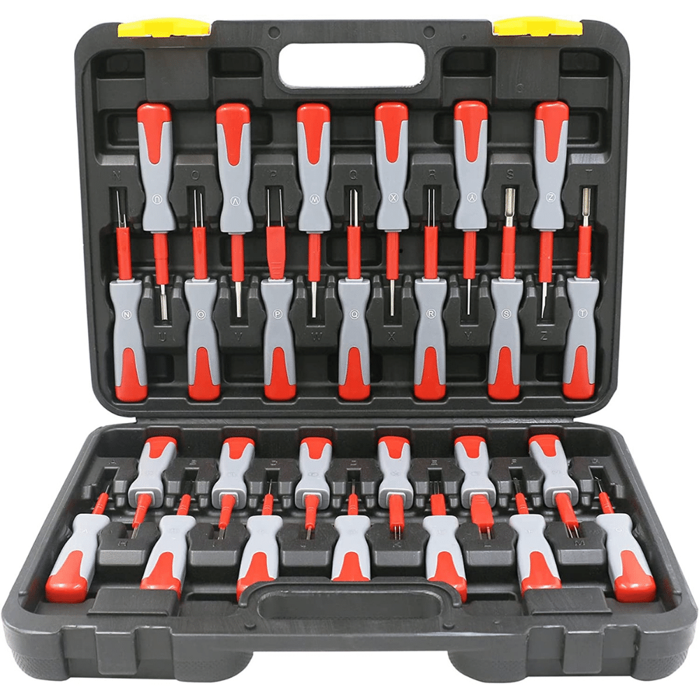 The YSTOOL Terminal Release Kit Tools come in a heavy-duty plastic blow-molded carrying case for easy transportation, simple storage, and quick organization. Each handle of pin extractors is identified with numbers for quick reference to the well-illustrated application chart. Constructed of alloy steel, these extractors are designed for maximum strength and longevity. The rustproof surface and some adjustable pins provide reliable use in various applications. The rubber handle applies ergonomics, providing a comfortable & non-slip grip and insulating performance. This terminal release kit is essential for anyone who needs to quickly and easily remove pins from terminals. You don't have to pry the terminal pins, eliminating any possible error while removing pins from the connector. Just push and pull the terminal pins. These versatile terminal removal extractor tools can flawlessly remove terminal wires from the wire harness connector without damaging wires or terminal blocks.
